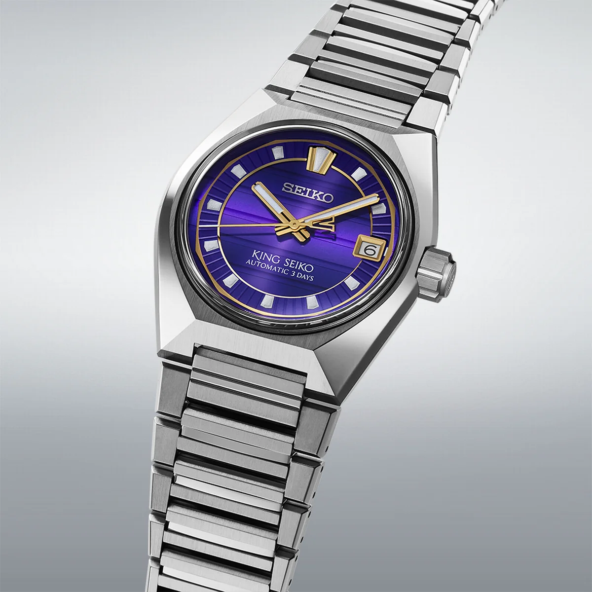 In the 1960s, King Seiko timepieces led Seiko Watch Corporation�s developments in world-leading technical precision. �King Seiko� originated when multiple Seiko watchmakers created different watches to encourage innovation � one of the Japanese watch brand�s constant aims.In 2025, the new King Seiko VANAC channels Seiko archive inspiration from the iconic 1970s collection of the same name. Since Tokyo was the birthplace of King Seiko, the design theme of the modern VANAC is centred around this world-renowned metropolis through �Tokyo Horizon;� a series of watches expressing the city of Tokyo stretching out over the skyline. The purple dial of this �Tokyo Twilight� timepiece is inspired by the violet-coloured hour between daylight and darkness over the Tokyo cityscape.The VANAC name is an acronym of its original design features: V for a 'Vibrant case design;� A for 'Active lifestyle' � for both formal and informal occasions; N for 'Novel dial ring' � its angular edges resembling a metropolis cityscape; A for 'Alternative dial design' - a 3-dimensional dial design inspired by the horizon; C for 'Comfortable bracelet' - a short-pitch length bracelet, completed with a mirror and hairline finish.Powered by the new in-house built 8L45 mechanical calibre, it has been crafted with the highest accuracy of Seiko mechanical movements - accurate to +10/-5 seconds per day with a three-day power reserve. Long live the new King Seiko: modernised elite watchmaking, yet its stately, dignified and majestically classic looks remain.