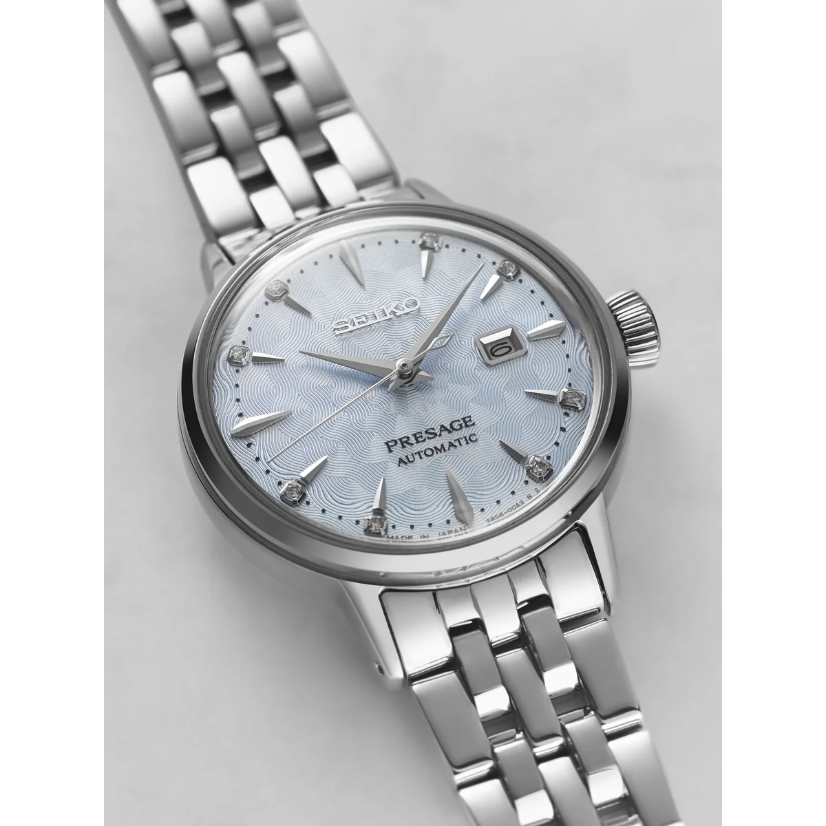 Presage Cocktail Time 'Skydiving' Diamond TwistIntroducing new, petite and compact designs from the Presage Cocktail Time collection; watches inspired by the Japanese cocktail culture in Tokyo�s sophisticated Ginza area.Traditionally �Nomunication hour� � a hybrid of nomu (drink) and communication, is after 5pm � when it�s cocktail hour and time to talk things over. The Seiko Presage Cocktail Time collection was inspired by this Japanese tradition � with each timepiece named after drinks mixed by Hisashi Kishi, head bartender of Star Bar in Tokyo�s Ginza area.Designed to reflect the light, the textured dial of this timepiece is inspired by the blue of the �Skydiving� cocktail itself and features eight diamonds, the accompanying five row bracelet is a new design, created to enhance sparkle. The slim watch case is 30.3mm in diameter and includes the new in-house 2R05 calibre.Seiko Presage: Timeless looks, precisely Japanese mechanical timekeeping.Minimalistic watch designs with a distinctly Japanese aesthetic.